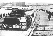 Тяжелые танки переправляются через Волгу по льду.